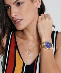 Relógio com pulseira feita em placas metálicas articuladas. A caixa de formato redondo foi desenvolvida em metal. O visor é analógico. A resistência é de 5 ATM, permitindo nadar enquanto usa a peça. Acompanha um par de brincos e um colar com pingente em strass.