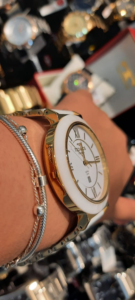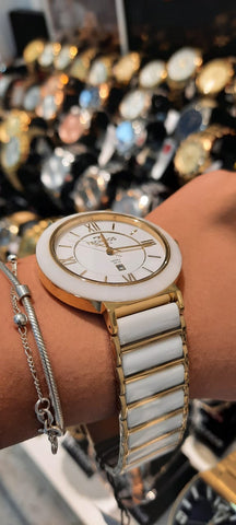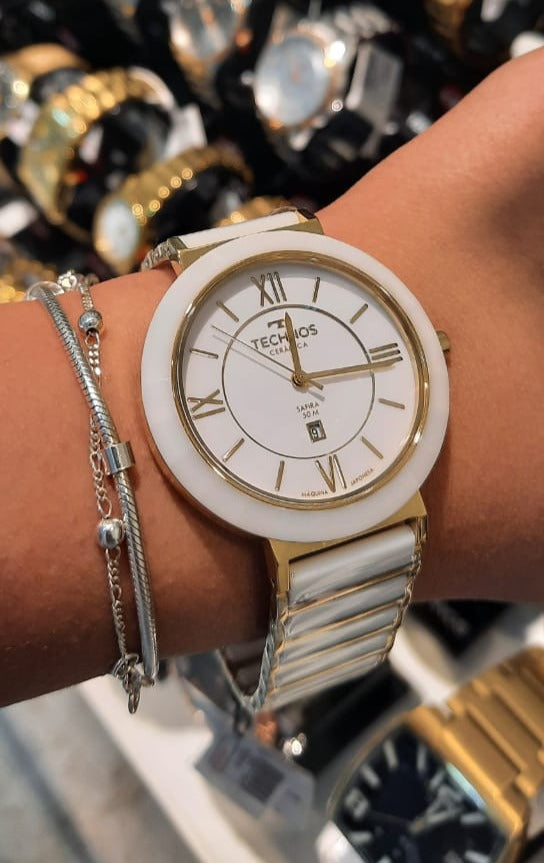 - Cor da Pulseira: Branco e Dourado