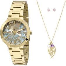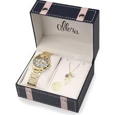 Kit 3pçs Relógio Allora AL2036CI/K4V Dourado, com design elegante e prático. Acompanha caixa, par de brincos e colar banhados a ouro 24k.